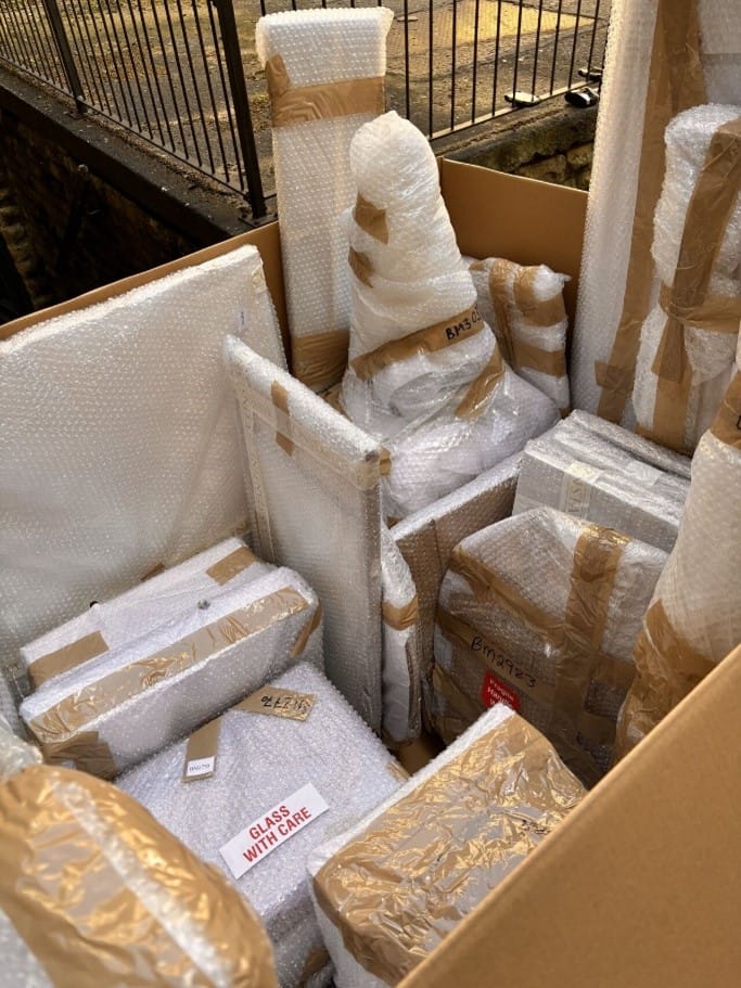 Given the complexity of the site, careful planning was essential. The uplift spanned six days, during which our team secured and prepared the items for transport to Winsford, Cheshire. This process involved extremely detailed planning to address the tricky access points and multiple floors of the building as well as, precise preparation, ensuring all 1450 boxes, crates and oversized items were prepped and palletised for safe and secure transportation.